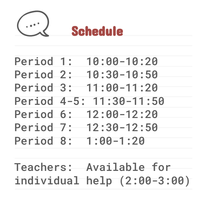 6. Teachers will be available for questions through email or individually scheduled help until 3:20 PM.